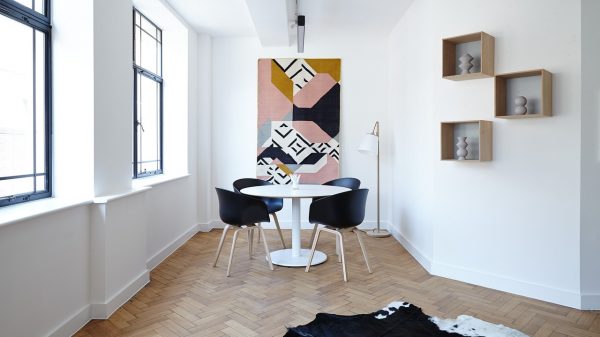 Paredes: Al añadir una gran cantidad de colores a tu decoración, las paredes deben estar en tonos vivos, que contrasten o complementen los colores de los muebles. También puedes optar por papel pintado con patrones geométricos o crear formas geométricas con pintura para dar un toque moderno y dinámico.